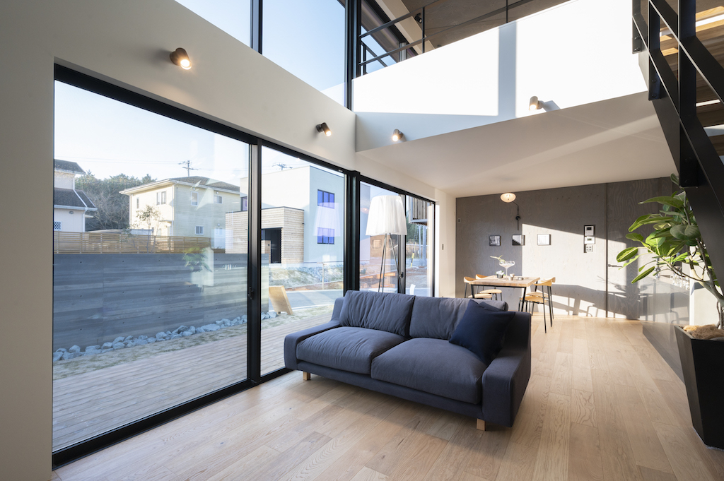 LDKは吹き抜けに大きな窓が連なり、開放的でダイナミックな空間が広がっています。また、1フロアで暮らしを完結できるよう設計されており、将来を見据えた間取りに。2階は自由に使えるフリースペースが広がり、家族 のライフスタイルの変化に対応できる空間に。