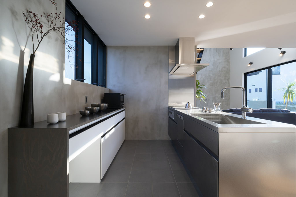 モルタルのグレーと白いペイント壁、部分的に黒を使った内観は、シックで落ち着いた空間が広がっています。