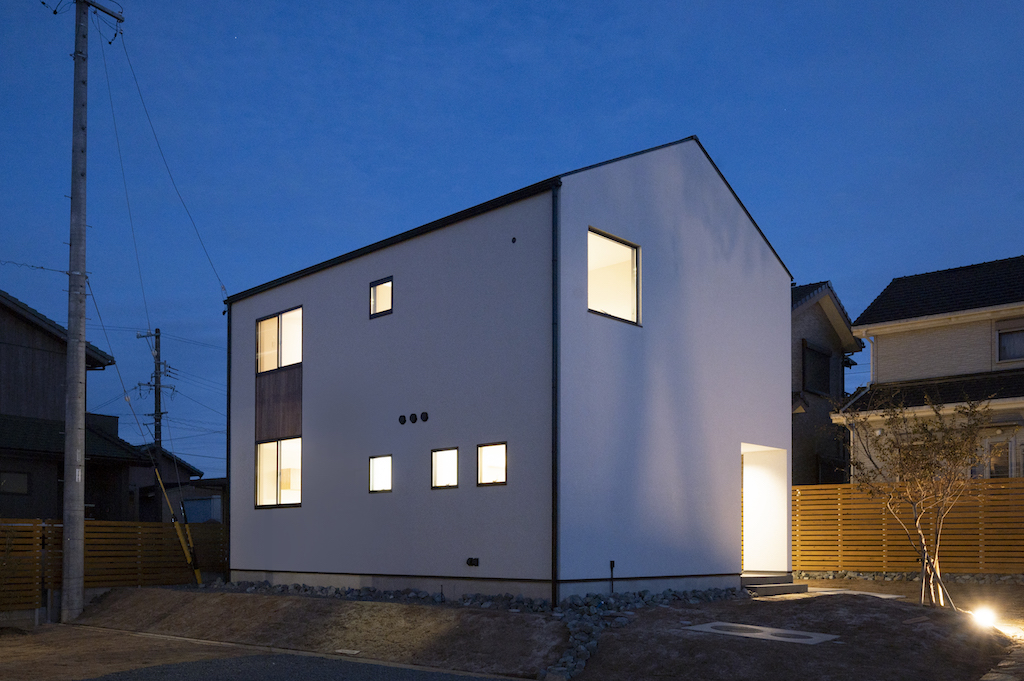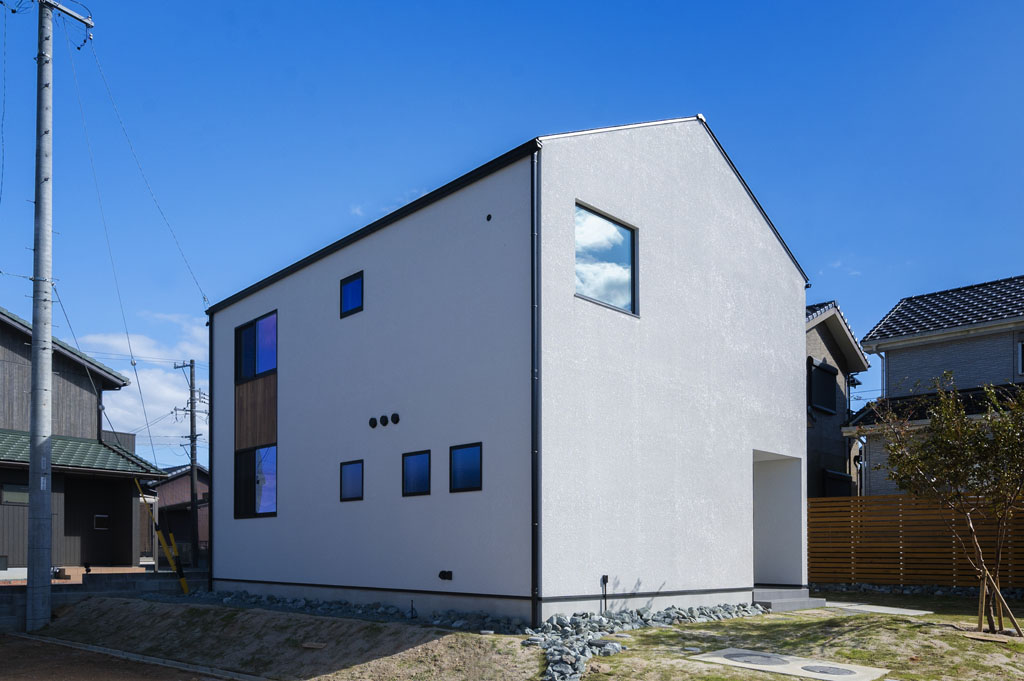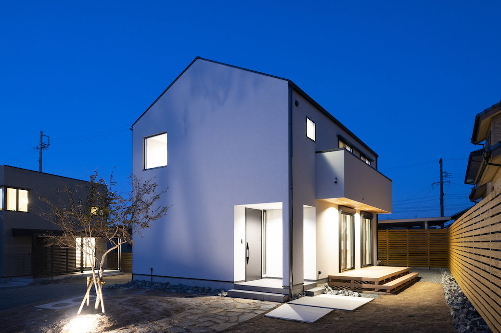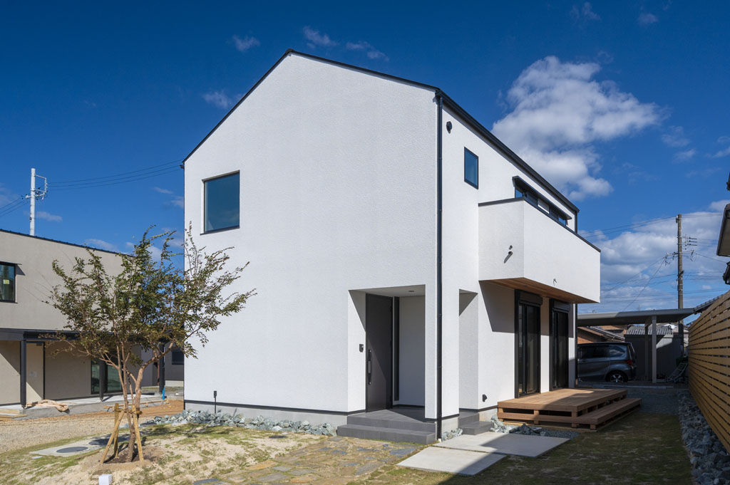 少しグレーがかった白い外壁に、窓や屋根を黒色にすることでぼんやりした印象にならず、家全体を引き締めています。