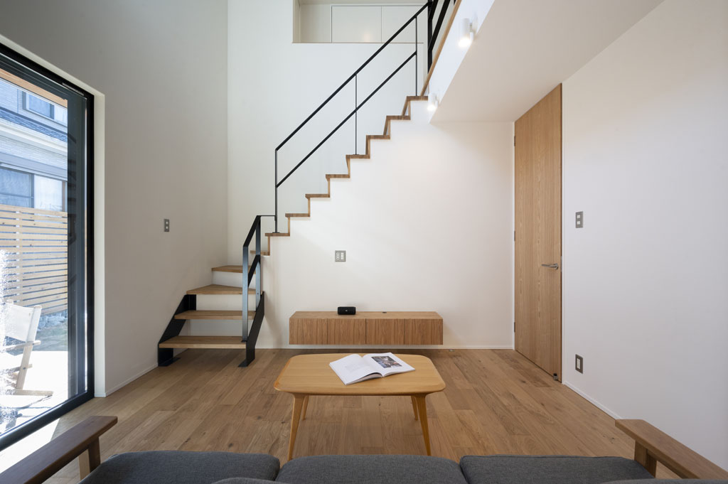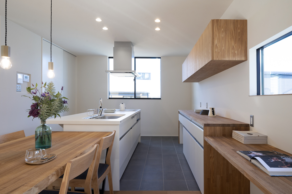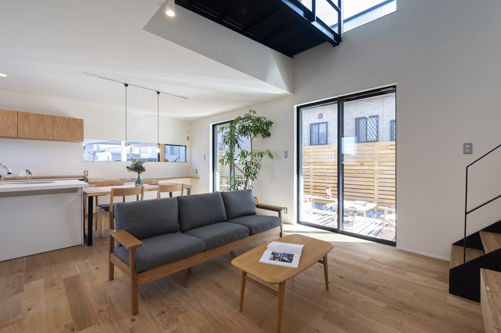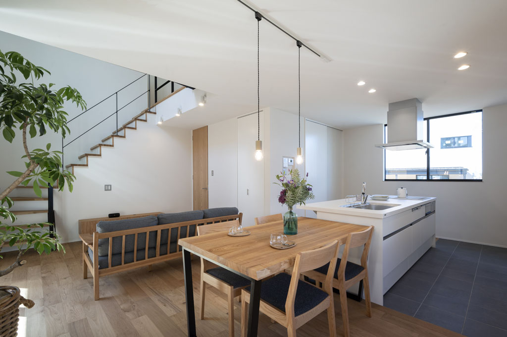 大きな窓からは明るい光が差し込む、吹き抜けのある広々とした空間が気持ちの良いリビングダイニング。オープン型のキッチンからは家族とのコミュニケーションが取りやすく、毎日の食事や会話が楽しみになりそうです。また、キッチン後ろから横に続く広いスタディカウンターは使い方が自由な家族にとっての万能スペースに。木をふんだんに使ったLDKは柔らかい雰囲気を創り出し、吹き抜けの上部を通るアイアンの階段が全体を引き締めながら、遊び心のある空間に仕上げています。