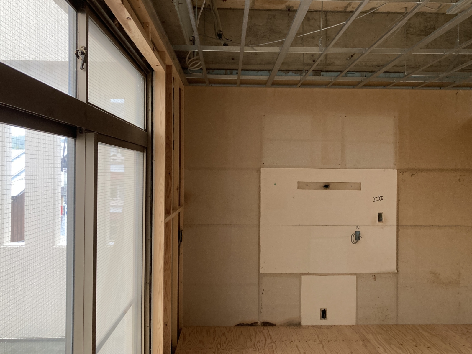 天井のボード張りへと進み、